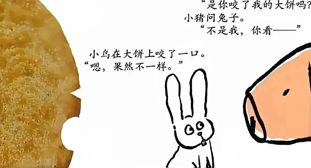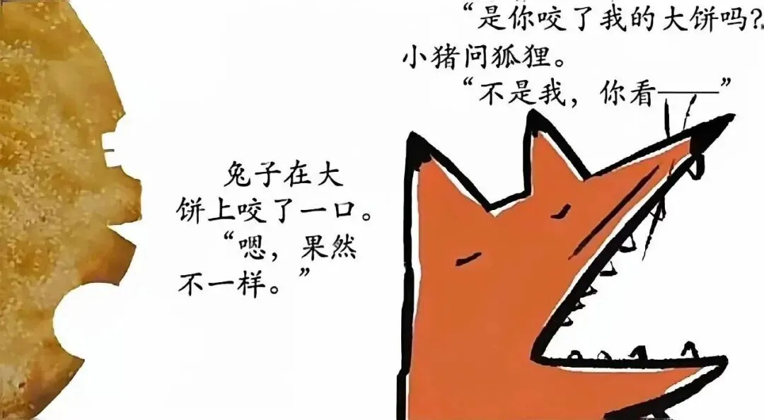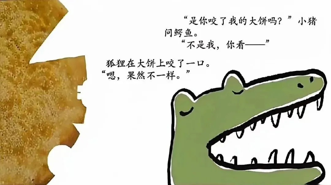 《谁咬了我的大饼》是一本幽默、有趣,又充满悬念的绘本。故事讲述是小猪做了一张大饼,累得睡着了……醒来后小猪发现大饼被咬了一口,小猪通过牙印去寻找究竟是谁咬了它的大饼。小猪一次次地让动物们在大饼上咬上一口,以此来找出那个在自己睡觉时偷咬大饼的动物。故事情节轻松诙谐,结局出人意料,既能让孩子在阅读绘本中始终充满好奇心,也能认识不同动物的牙印特征。小猪做了一块好大的饼,累得睡着了,醒来后发现大饼少了一块。于是,小猪开始寻找“咬饼凶手”,它问了小鸟、兔子、狐狸、鳄鱼、河马等动物,每个动物都在大饼上咬了一口,留下了不同形状的牙印,但都和最初饼上的缺口不一样。最后,小猪的肚子饿得咕咕叫,它自己也咬了一口大饼,这才发现……