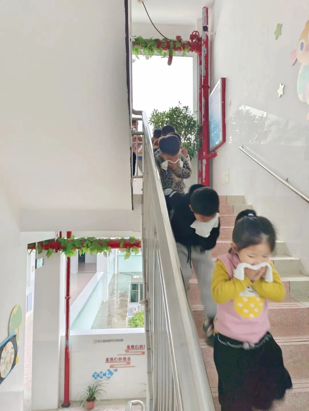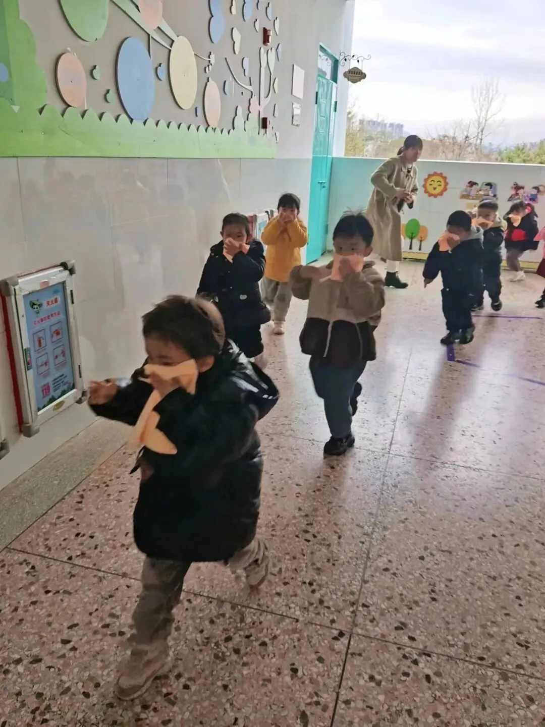 全体师生按照指定疏散路线撤离到安全区域后,各班教师立即清点人数,查看幼儿情况,安抚幼儿情绪,并上报各班撤离情况。