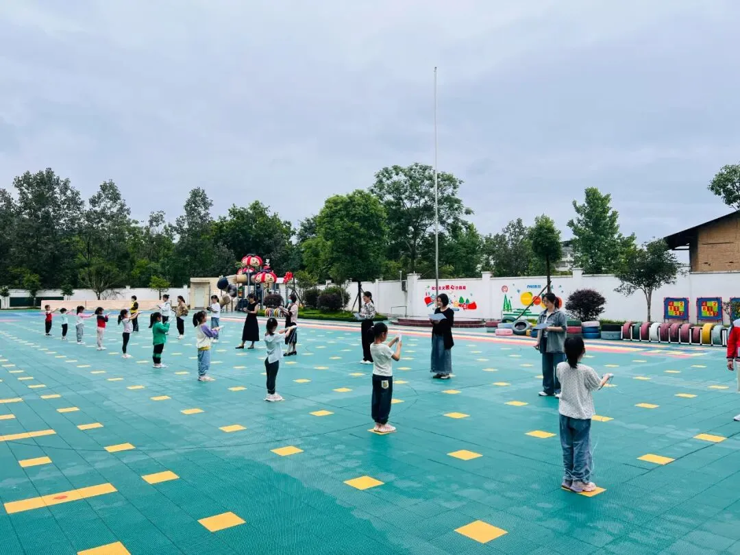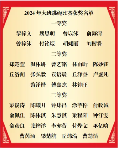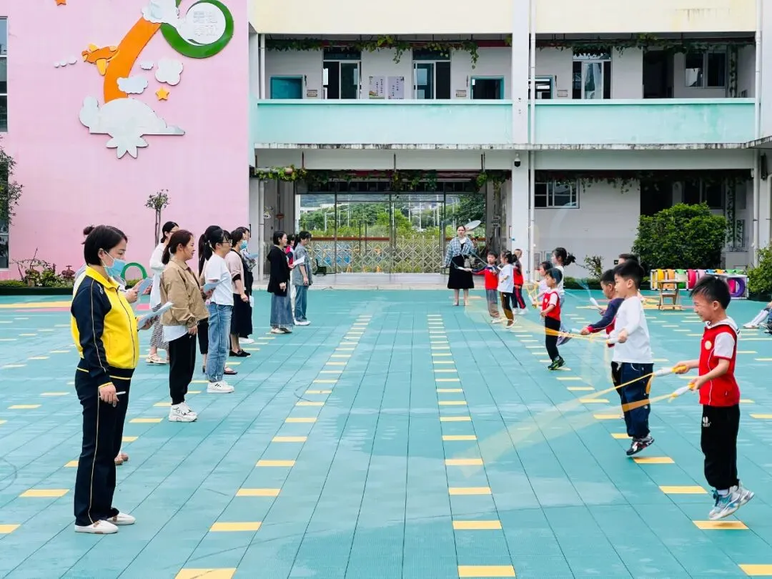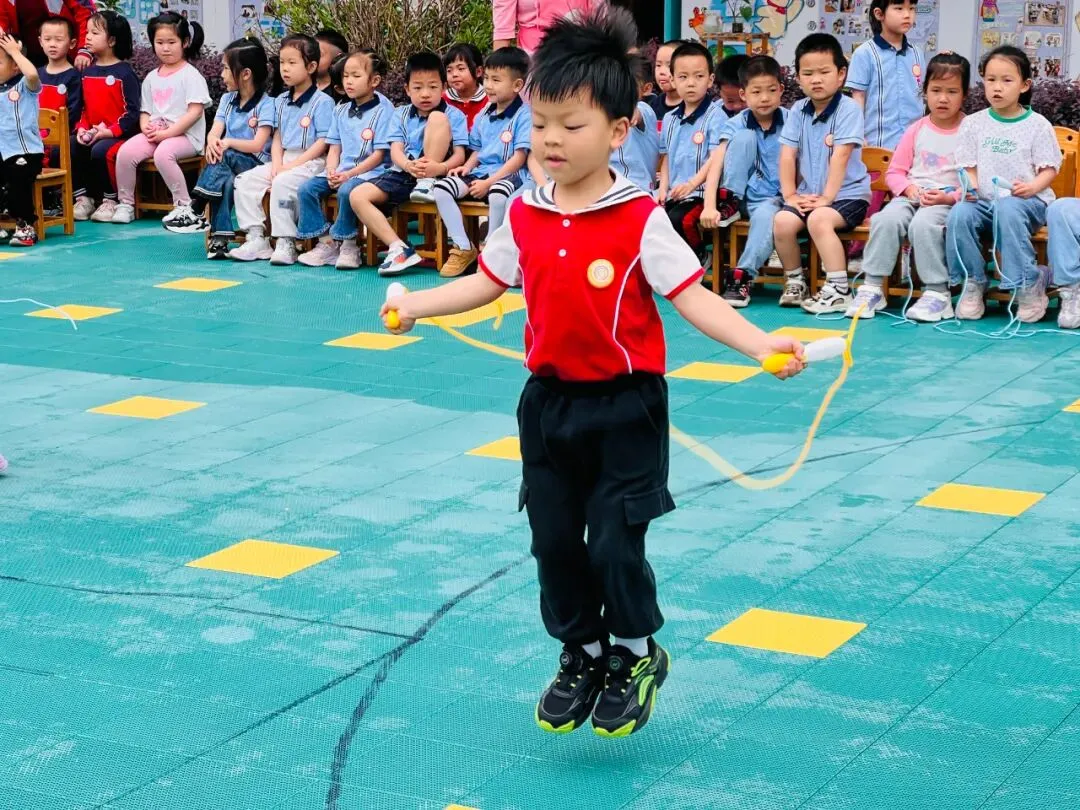 跳绳活动对于大班孩子来说是一项较有挑战性的运动,它能增强幼儿的体质,能有效的促进幼儿大肌肉动作的协调发展。瞧,赛场上一片欢腾的景象,只见一根根彩绳飞舞,一个个选手龙腾虎跃,充分体现大班孩子们的比赛热情。