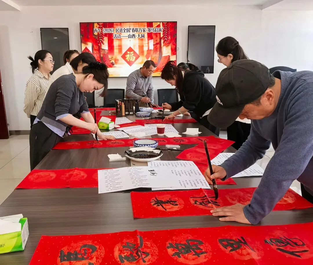 为弘扬中华优秀传统文化,彰显民进文化界别优势,凝聚会员情感共识,1月28日下午,民进大同市委会在晋控煤业集团开展丙午(2026)民进全国“春联万家·策马启新”活动。民进大同市委会专职副主委兼秘书长来小英,书法界会员王九明、李选、徐珂、赵丹妮,晋控煤业总支主委力宏才及总支10余名会员参加。