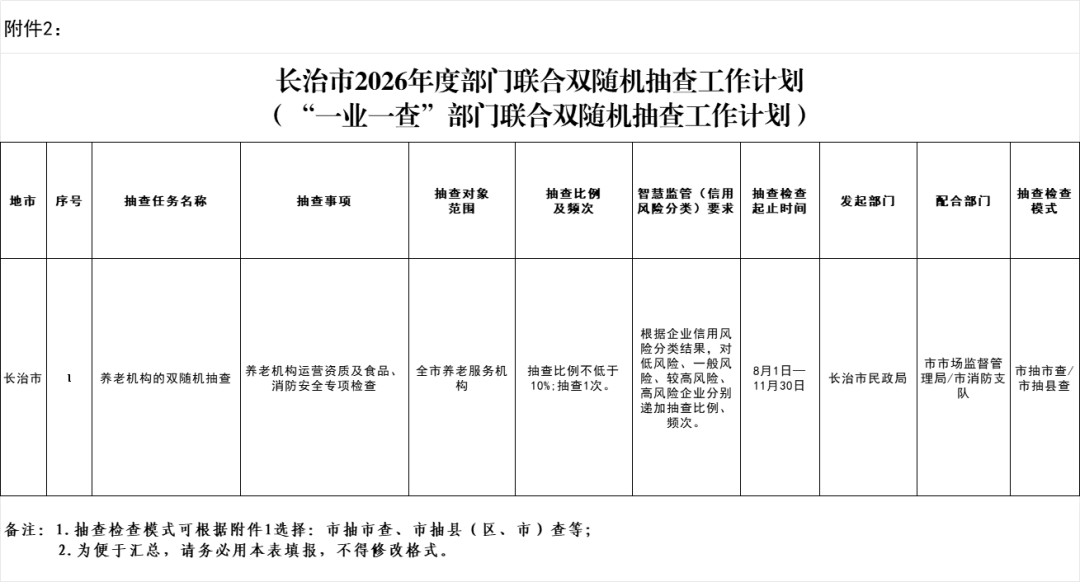 为深入贯彻落实《山西省市场监管领域部门联合“双随机、一公开”监管抽查事项清单》及我市相关工作部署,切实筑牢养老服务机构安全防线,有效防范化解各类运行风险,结合我市养老服务工作实际,制定2026年度养老服务机构“双随机、一公开”联合监督检查工作计划,现将有关事项明确如下:(一)检查依据。根据《中华人民共和国安全生产法》《中华人民共和国消防法》《中华人民共和国食品安全法》《养老机构管理办法》《养老机构重大事故隐患判定标准》《养老机构行政检查办法》等法律法规及规范性文件要求,组织开展本次联合监督执法检查工作。(二)检查对象。全市范围内依法完成登记备案的养老服务机构。(三)联合检查单位。由长治市民政局作为发起部门,联合长治市市场监督管理局、长治市消防救援支队共同开展检查工作。本次联合检查采取实地检查为主、书面检查为辅的方式,重点围绕以下方面开展一体化、综合性监督执法检查。(一)综合管理合规性。检查养老服务机构登记备案手续完备情况、法定代表人资质合规情况、服务范围公开公示情况、服务合同签订规范情况、收费标准明码标价情况及24小时值班制度落实情况等。重点排查是否存在违规收取大额预付费、承诺高额回报,以及以“养老”名义变相开展非法集资等违法违规行为。(二)消防安全。全面检查灭火器、火灾报警与喷淋系统、应急照明等消防设施器材的完好有效性;检查消防控制室值班值守规范情况及操作人员持消防设施操作员证上岗情况,核实安全疏散通道、安全出口畅通情况。重点排查电气线路敷设及使用安全,规范取暖设备使用管理;严禁电动自行车违规停放、充电行为;核查厨房燃气使用安全管控情况及油烟管道定期清洗记录;清理拆除影响人员逃生和灭火救援的各类障碍物,及时整改消除安全隐患。(三)食品安全与特种设备安全。食品安全方面,检查食品经营许可证持有情况、从业人员健康管理情况,以及食材采购验收、储存保管、加工制作、餐食留样、餐具清洗消毒等各环节管理制度落实情况。特种设备安全方面,检查电梯、锅炉等特种设备使用登记、定期检验检测情况,以及作业人员持证上岗情况。(四)服务安全与应急管理。检查养老服务机构防跌倒、防坠床、防烫伤等意外伤害防范措施落实情况,探访管理制度执行情况,应急预案制定、修订及应急演练开展情况,以及安全宣传教育培训记录完整情况。(一)抽查时间。2026年8月1日至11月30日。具体检查时段根据市级“双随机、一公开”监管工作平台任务设置确定,合理统筹检查时序,避免出现检查扎堆、重复检查等问题。(二)抽查基数与比例。以全市纳入监管名录库的养老服务机构为基数,结合信用风险分级、过往检查情况等,科学确定差异化抽查比例。对高风险、投诉集中、有严重失信记录的机构,提高抽查比例;本次抽查总比例原则上不低于10%。(三)抽查方式。通过市级“双随机、一公开”监管工作平台,随机抽取确定检查对象;从市民政局、市市场监督管理局、各县区消防救援大队执法检查人员名录库中,随机匹配执法检查人员,组建联合检查组开展联合检查工作。检查实施阶段,执法人员须主动出示执法证件,对照本计划检查内容及职责分工,一次性完成现场检查,分别如实记录情况并共同填写统一制式《联合检查记录表》。记录须经被检查机构负责人签字或盖章确认,拒绝确认的注明原因。对重大安全隐患或涉嫌违法违规行为,按职责权限依法处置并跟踪督办,确保整改到位。联合检查结果由发起部门牵头汇总,检查结束后通过市级“双随机、一公开”监管平台及各联合检查单位门户网站统一公示。对检查中发现的问题,按照“谁主管、谁负责”原则依法处置;涉嫌犯罪的,依法移送司法机关处理,查处结果同步公示。相关信息统一归集至被检查机构信用档案,纳入信用评价体系并依法实施联合惩戒。(一)强化统筹协同。市民政局作为发起部门,牵头负责联络协调、任务发起、进度跟踪、结果汇总及公示等工作。各联合检查单位需明确专人负责,健全沟通协作机制,保障各项工作衔接顺畅、高效推进。(二)规范执法实施。检查前,各部门要组织执法人员开展针对性业务培训,重点熟悉检查内容、执法流程、判定标准及监管平台操作规范,提升执法专业性与规范性。执法人员须严格遵守行政执法程序、廉洁自律规定及工作纪律,坚持文明公正规范执法,推行电子化检查手段,减少纸质材料使用,提高工作效率、减轻基层及被检查机构负担。(三)注重总结提升。联合检查结束后,各部门要及时总结工作成效,深入分析问题不足,不断完善养老服务领域“双随机、一公开”联合监管机制,持续提升综合监管效能,为我市养老服务事业高质量发展筑牢保障。附件:《长治市2026年度部门联合双随机抽查工作计划(“一业一查”部门联合双随机抽查工作计划)》