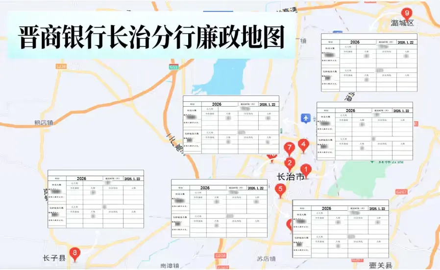 在地图上,主要标注了各党支部地理位置、员工人数、廉政谈话人数、纪律处分和积分处理人数、党支部廉情风险点等信息,根据实际情况动态更新。该图以“地图+简况”形式将支行的“廉情”多维度展示,为纪检干部“一线访廉”提供航标、指南,让日常监督有址可寻、有事可说、有据可依。