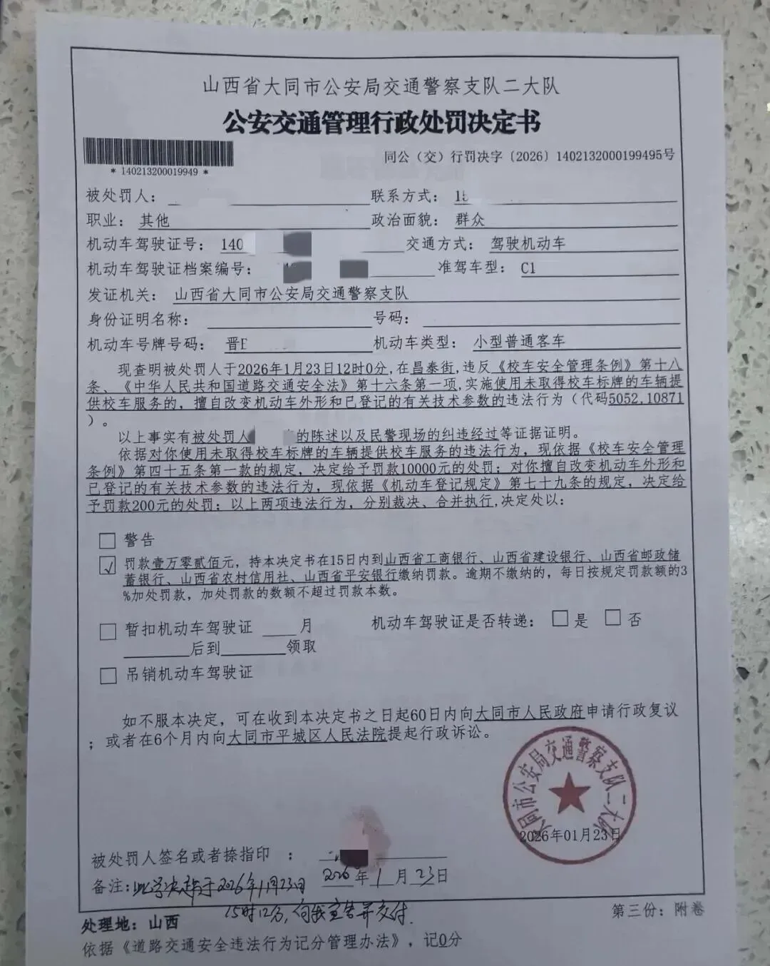 大同:丰某某被罚款10200元...