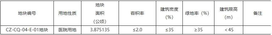 规划确定CZ-CQ-04-E-01地块用地性质为医院用地(用地代码:080601),实际用地面积38751.35㎡(3.875135公顷),依据规划用地性质赋予地块相应控制性指标,后附地块用地规划图、地块控制性指标一览表。
