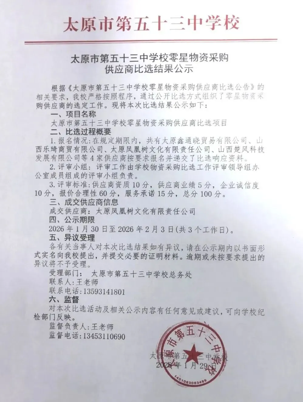 太原市第五十三中学校零星物资采购供应商比选结果公示