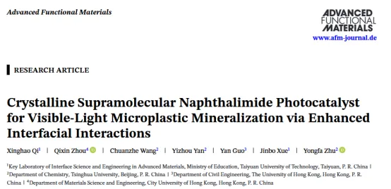 通过量化溶解性无机碳(DIC)和二氧化碳(CO2)的释放来追踪微塑料碳骨架的命运。直接测量CO2的产生量(图2c)证实矿化度超过85%,这意味着大部分ABS碳骨架已完全转化为CO2,实现了真正的微塑料矿化,而非简单的碎片化。通过扫描电子显微镜(SEM)直接观察ABS的降解过程表明,随着辐照时间的增加,ABS颗粒经历了逐层表面蚀刻,平均粒径从初始的25.46 ±5.56 µm减小到2.27 ±0.55 µm(图2d)。粒径分布的动态变化与零级动力学模型高度吻合,证实了以表面侵蚀为主导的降解机制,有效避免了微塑料的二次生成。这些结果充分证明了界面工程设计的重要性:通过精确调节有机半导体和微塑料之间的弱相互作用,可以实现有效的吸附-催化协同作用,为解决微塑料污染提供了一种新的技术途径。