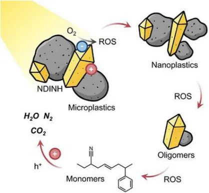 Fig. 3. Depolymerization and Mineralization Process of Microplastic Particles. (a) Intermediate products detected by LC-MS during the degradation and mineralization of ABS by NDINH. (b) Schematic diagram of the ABS degradation and mineralization mechanism. (c) Hydroxyl radical, (d) Singlet oxygen, and (e) Superoxide radical signals generated by NDINH under in situ light irradiation, measured by EPR. (f) Morphological changes of ABS during in situ degradation observed by confocal optical microscopy.