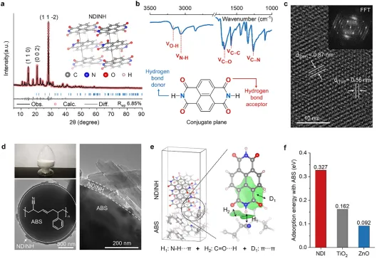 Fig. 1.Interaction between Conjugated Facets and Microplastics. (a) Experimental and simulated XRD patterns of NDINH. Insect: The refined unit cell of NDINH. (b) Above: FTIR spectrum of NDINH. Below: Molecular structures of NDINH and ABS, with hydrogen bond donors and acceptors labeled. (c) Cryo-TEM image of NDINH, The FFT pattern of NDINH (d), Optical image of ABS, Schematic illustration of the NDINH/ABS interfacial interaction obtained by HRTEM (left), HRTEM image of NDINH/ABS interface (right). (e) Hirshfeld partition of molecular density (IGMH) analysis of NDINH/ABS. (f) Bar chart of the interfacial binding energies for NDINH, P25, and ZnO in contact with ABS, calculated based on Density Functional Theory (DFT).