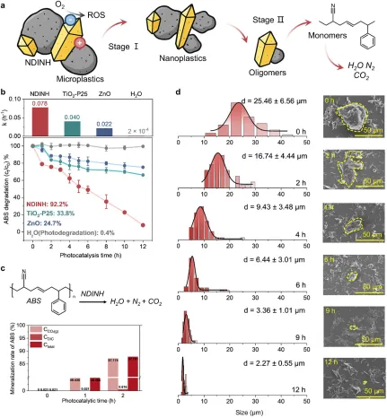 基于已证实的NDINH与ABS之间存在强界面相互作用,该团队进一步评估了其在可见光照射下对微塑料的降解性能。由于光生空穴和自由基的有效利用高度依赖于界面接触效率,因此先前确定的强界面相互作用成为决定催化性能的关键因素。为了更好地展示弱相互作用驱动的微塑料颗粒在水中的解聚和矿化过程,该团队提出了如图2a所示的两阶段反应路径:在第一阶段,在紧密的NDINH-ABS界面处,光生空穴(h+)和自由基协同攻击聚合物主链,引发C–C键断裂生成低聚单体。在第二阶段,这些中间产物通过开环氧化反应进一步降解,最终完全矿化为无机氮物种、水和CO2。