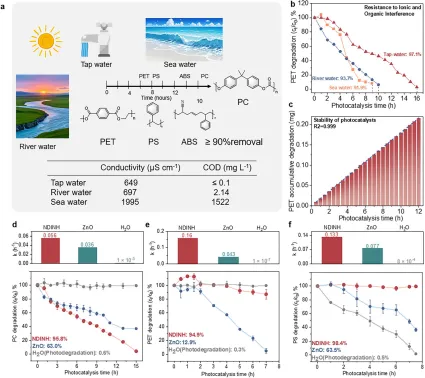Fig. 4. Versatility of NDINH photocatalysis for different microplastics and applicability to Different Water Matrices. (a) Schematic of molecular structures along with complete degradation of different microplastics in various water matrices. (b) Degradation efficiency of PET microplastics by NDINH in complex real water matrices: tap water, river water, and seawater under simulated sunlight (AM 1.5G). Reaction conditions: 24 mg of catalyst, 1 g L−1 of PET, in 120 mL of aqueous solution. (c) Evaluation of the NDINH/ABS photocatalytic system stability via cyclic degradation experiments. Photocatalytic degradation efficiency of NDINH for (d) PC, (e) PET, and (f) PS microplastics under simulated sunlight (AM 1.5G). Reaction conditions: 24 mg of catalyst, 1 g L−1 of microplastics in 120 mL of aqueous solution. the corresponding degradation rate constants (k) are compared, and data are presented as mean ± standard deviation from n = 3 independent experiments.