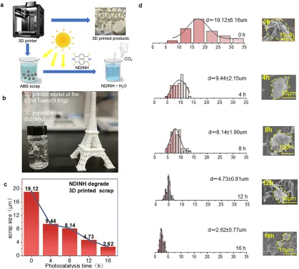 Fig. 5. (Photocatalytic Removal of 3D-Printing Derived Microplastic Particles by NDINH. (a) Process schematic for the degradation of 3D-printing waste by NDINH. (b) Photographs of the 3D-printed Eiffel Tower model and the generated waste material. (c) Variation in microplastic particle size over the NDINH photocatalytic degradation time. (d)Statistical size distribution of 3D-printed plastic particles during degradation by NDINH.).