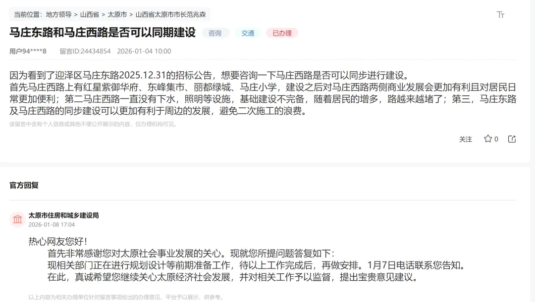 综上所述,马庄东路与马庄西路的建设是优化郝庄镇片区交通微循环、提升城市形象的关键一环。从官方回应来看,马庄西路的实质性改造虽已进入视野,但具体时间表仍有待后续工作的推进。周边居民期盼着相关规划能尽快落地,让这两条道路真正成为促进区域协调发展、便利市民生活的幸福通道。