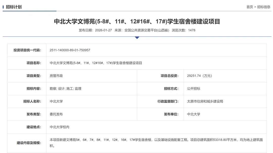 1月27日,官方发布了中北大学文博苑(5-8#、11#、12#、16#、17#)学生宿舍楼建设项目的招标计划。