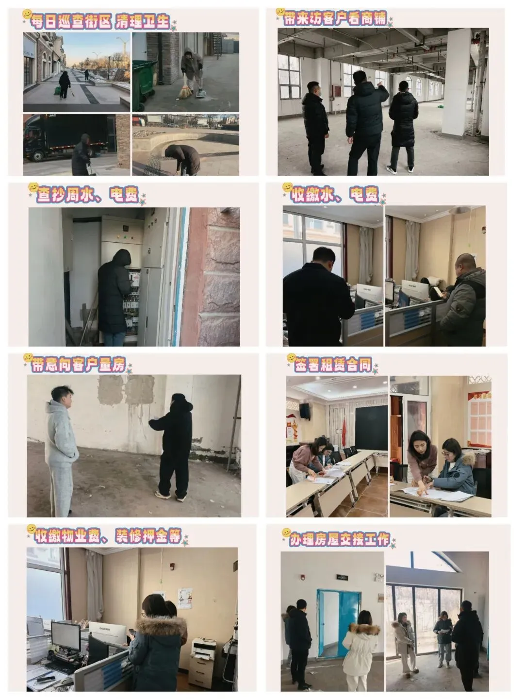 物业部每日梳理当日工作重点、真诚为商户解疑答惑、巡查街区清理街区卫生、每周查看水表电表,及时通知商户缴费、做好新入驻商户的交接事宜等,事无巨细的关注每个商户的需求,用心做好服务工作,以贴心的态度认真对待每一位商户。