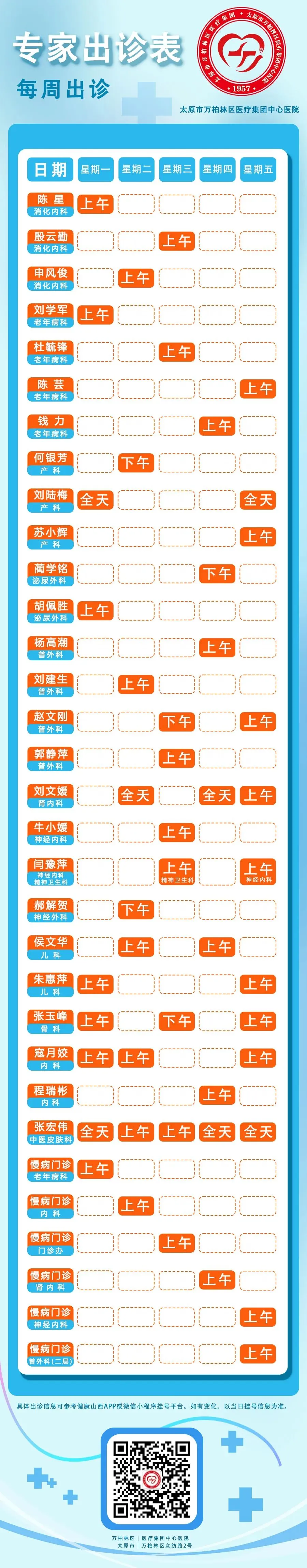 >【专家出诊】太原市万柏林区医疗集团中心医院2月2日——2月6日专家一周出诊表