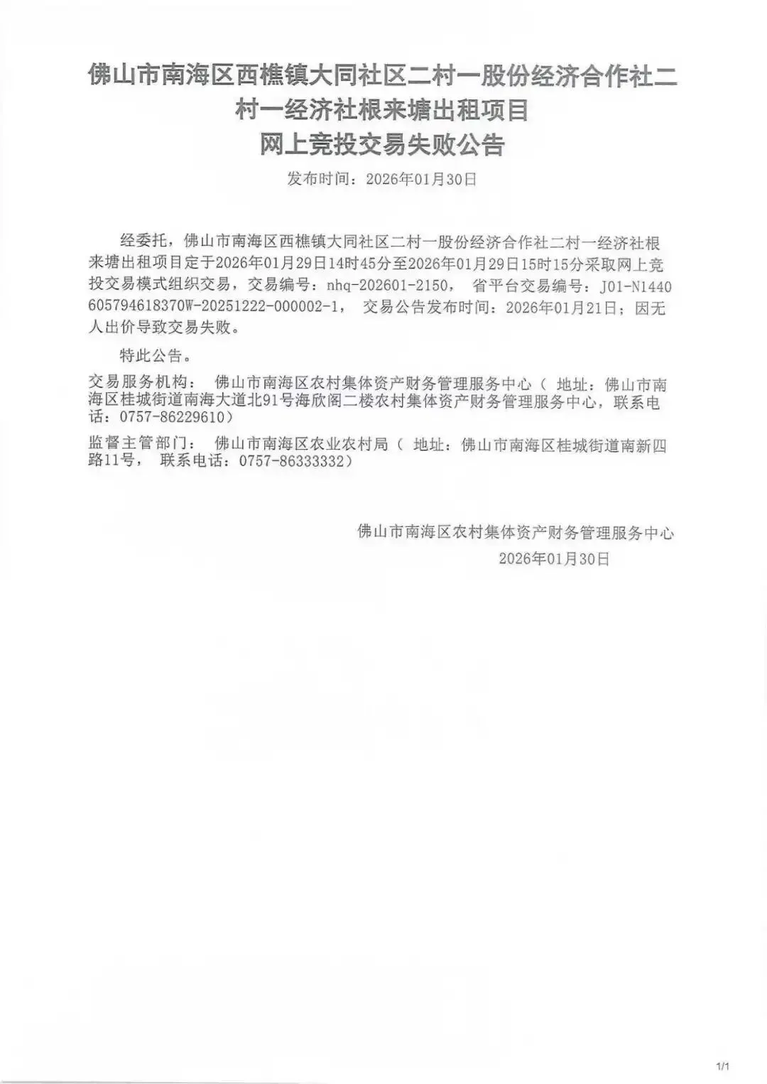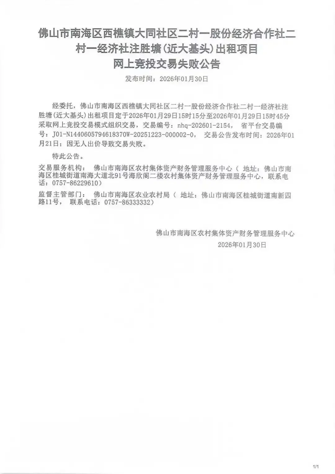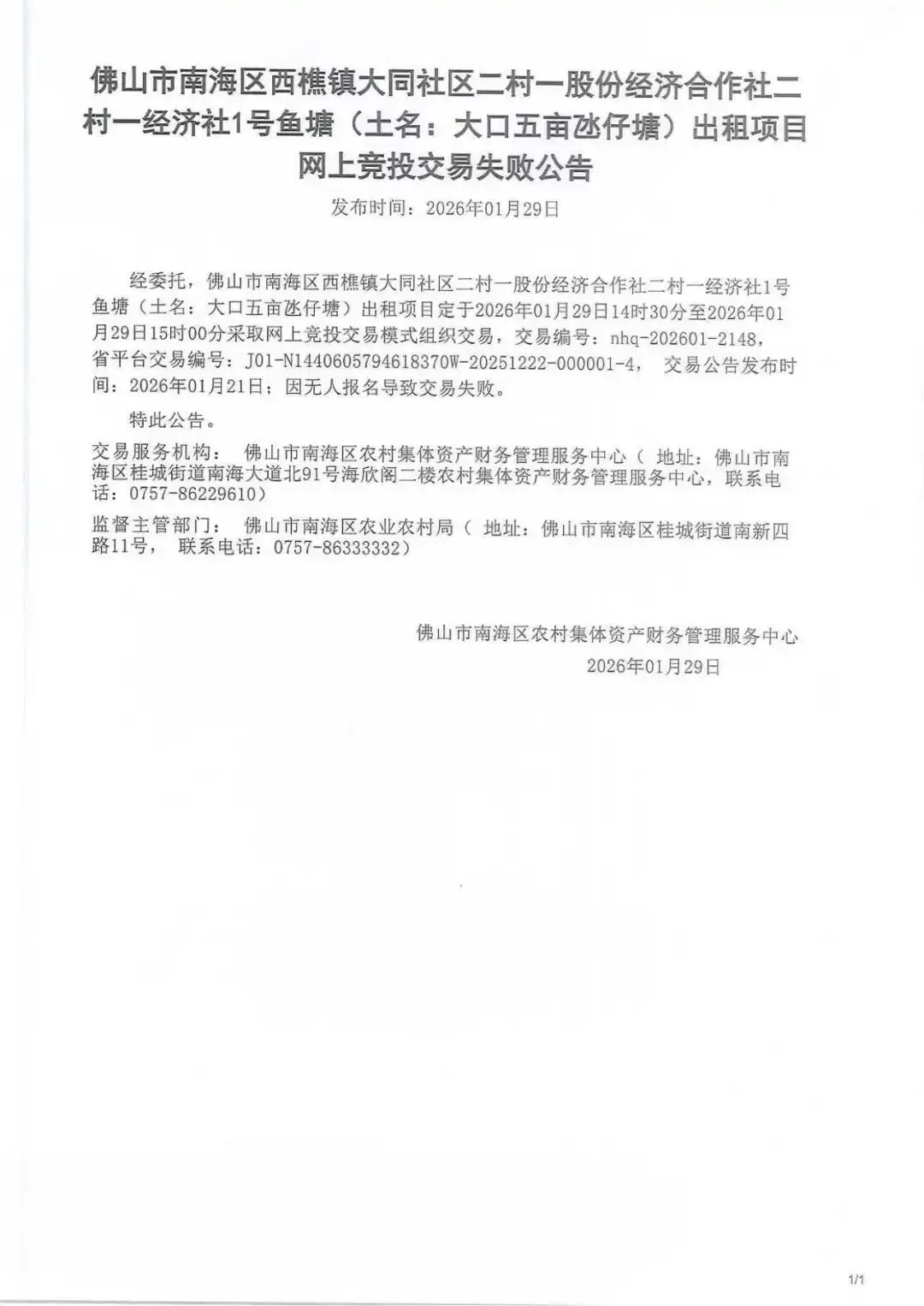 >大同社区二村一经济社根来塘、校元塘、注胜塘(近大基头)、1号鱼塘(土名:大口五亩氹仔塘)共4个鱼塘出租网上竞投交易公告