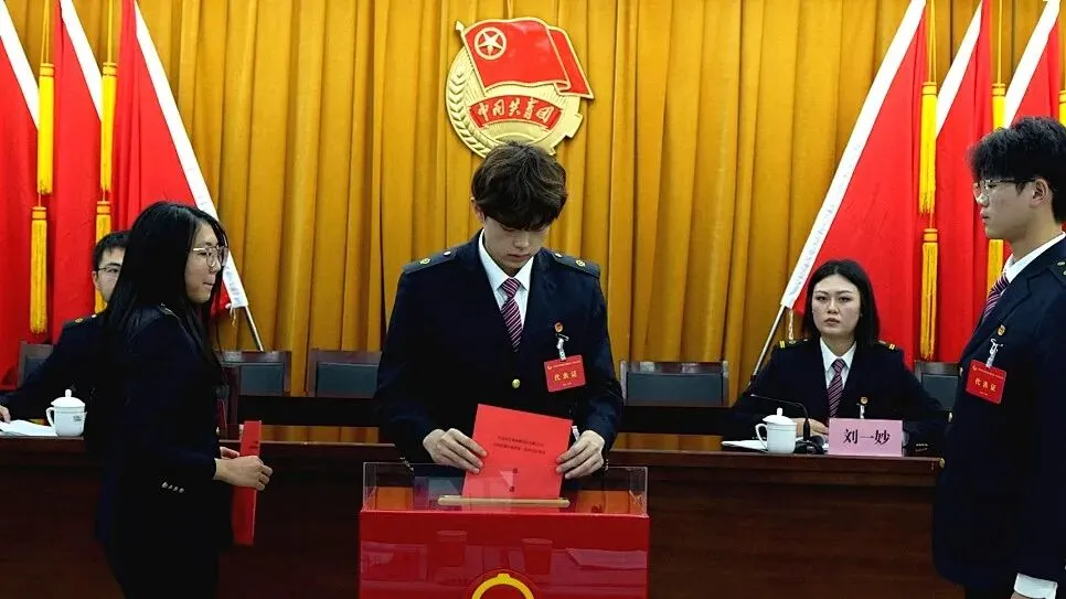 总监票人向大会报告正式选举计票结果,会议宣布《共青团大秦铁路股份有限公司大同房建公寓段第一届委员会当选委员名单》及新一届委员会第一次全体会议主持人。