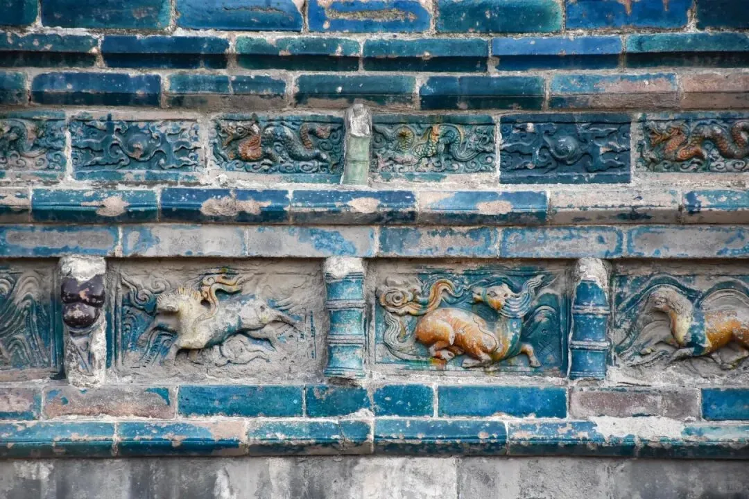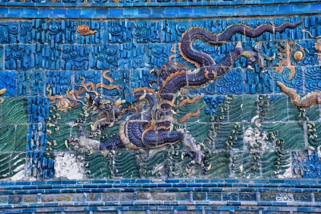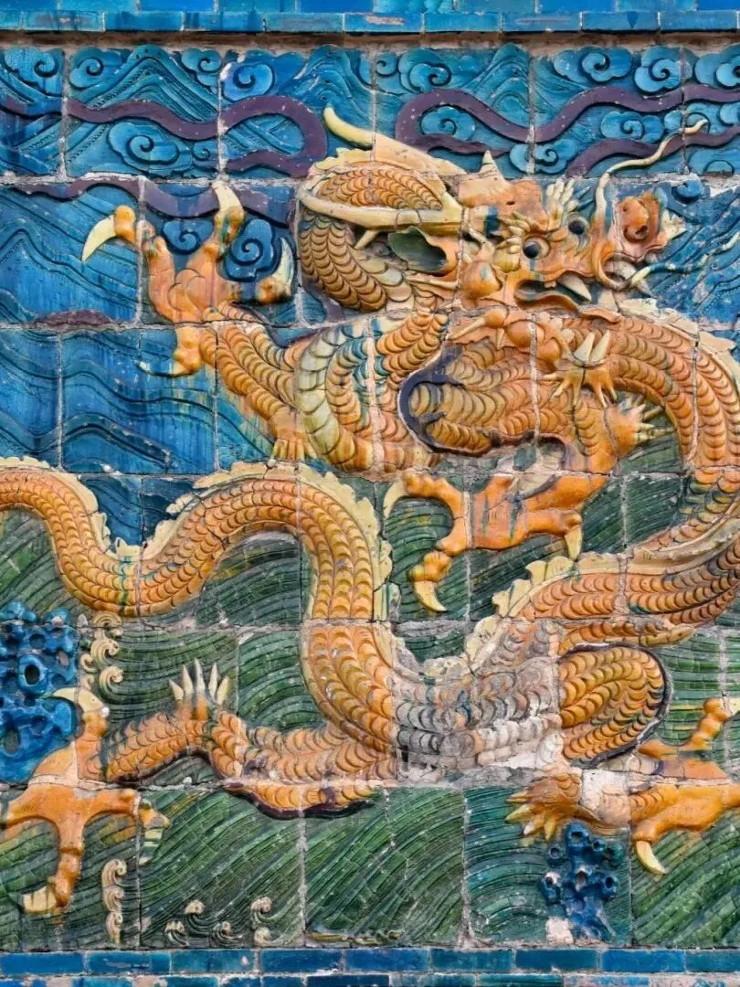 九龙壁的壁身细节堪称明代琉璃工艺的巅峰,青砖为基,外层琉璃砖经高温淬炼,色泽饱满如初,历经数百年风霜仍鲜亮夺目。