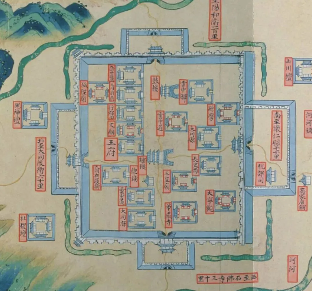 图中大同城城墙皆为蓝色,意为全部砖包,按明清地方志记载,大同城是徐达在旧土城上拓展而来,城基为石,墙包砖,高四丈二尺,周十三里,开四门,其外皆有瓮城。大同考古队曾发现大量洪武四年、五年大同城墙文字砖,与该图和地方志可对应。图中没有明清地方志中的总兵府、巡按府、都察院,因为此时大同总兵、大同巡抚等官职还没有设立。