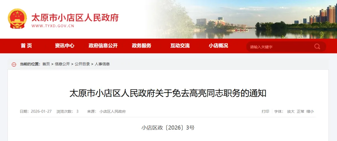 高亮同志的太原市小店区财政投资评审服务中心主任职务。