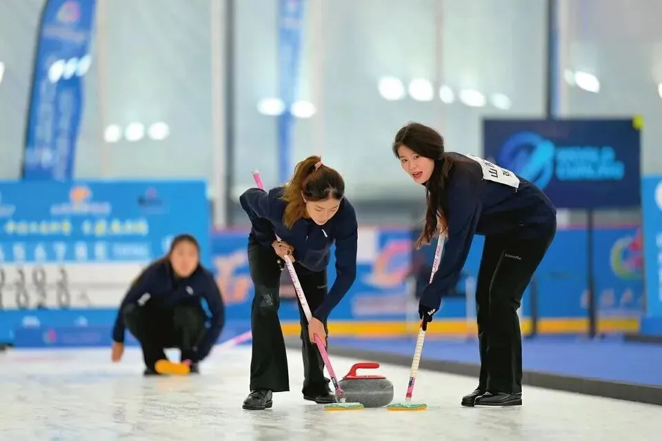 吕梁市离石区王营庄滑冰馆,选手在冰壶比赛赛场上激烈角逐。