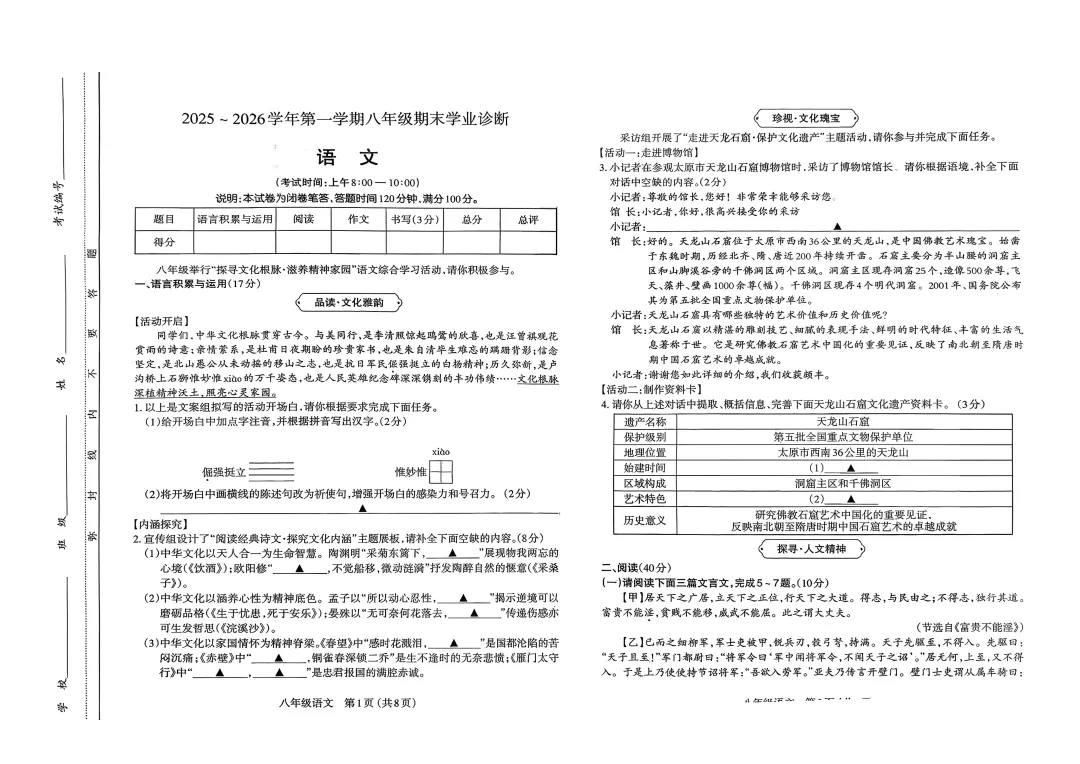9科全 | 太原2025—2026学年第一学期八年级期末学业诊断卷