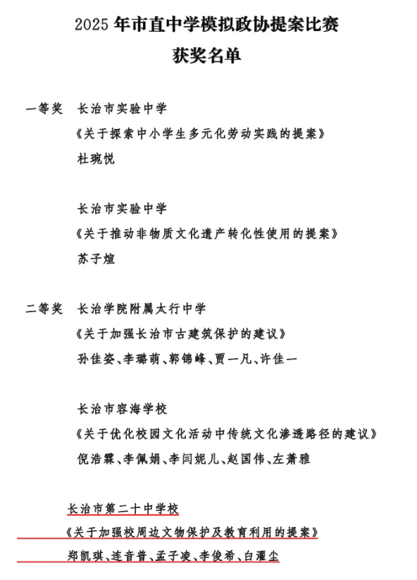 在长治市市直中学模拟政协提案比赛中,我校参赛团队雏鹰筑梦队围绕“加强校周边文物保护及教育利用”的主题深耕细作,指导教师刘瑾、隋亚敏及参赛学生郑凯琪、连音谱、孟子凌、李俊希、白濯尘、杨紫晗以严谨的调研、详实的内容和精彩的展示得到了评委对提案实用性与创新性的认可,最终斩获二等奖,充分展现了新时代中学生关注社会、建言献策的责任与担当。