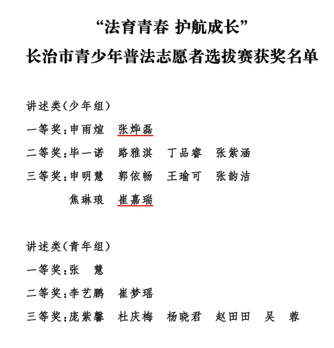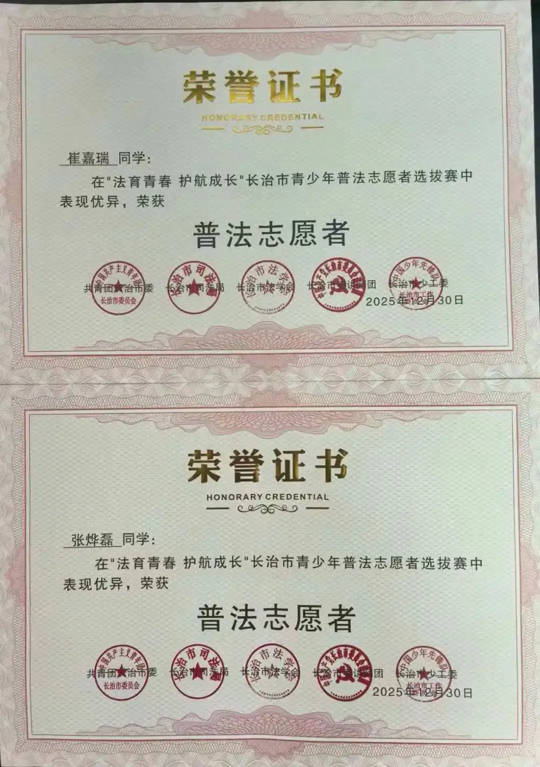 在“法育青春 护航成长”长治市青少年普法志愿者选拔赛讲述类少年组比赛中,我校参赛选手张烨磊、崔嘉瑞凭借生动的表达、深刻的普法理解,在赛场中脱颖而出,分别斩获一等奖和三等奖,彰显了我校学子良好的法治素养和语言表达能力。