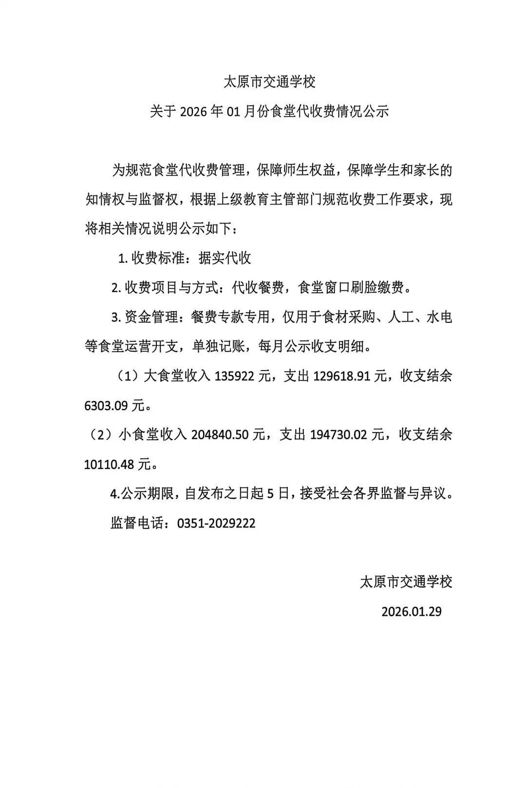 >太原市交通学校关于2026年1月份食堂代收费情况公示