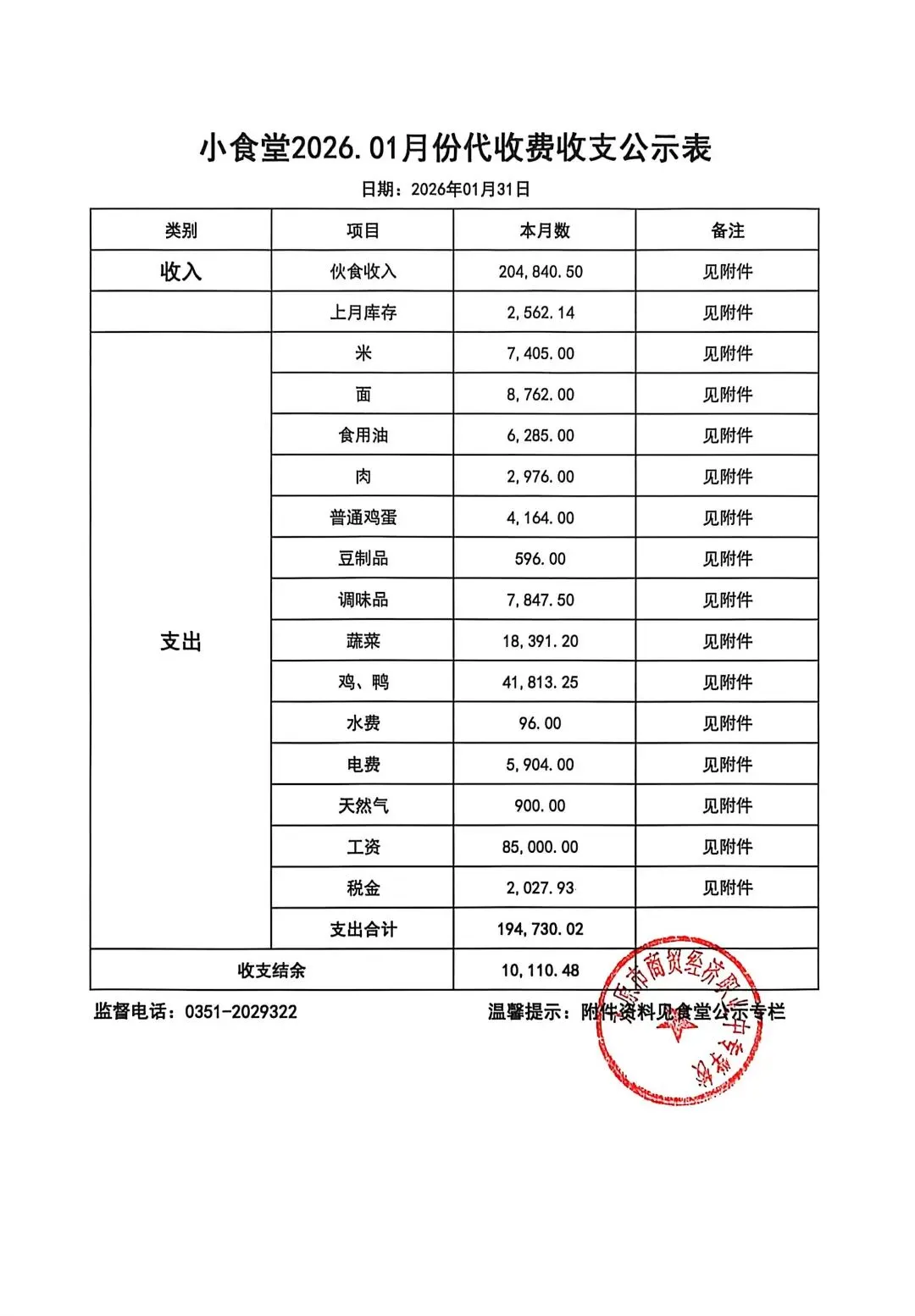 关于2026年1月份食堂代收费情况公示