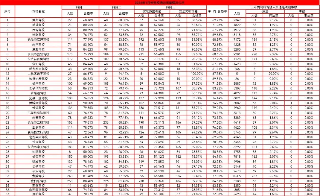根据《机动车驾驶证申领和使用规定》【公安部第172号令】第五十八条的相关规定,现向社会公告全市2026年1月份各驾校培训质量排名情况和考试员考试质量情况。