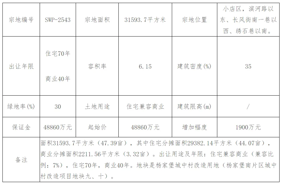 其中,SWP-2542位于小店区,长风街以南、长风街南二巷以西,出让面积50790.98平方米(76.19亩),住宅分摊面积47235.61平方米(70.86亩),商业分摊面积3555.37平方米(5.33亩)。