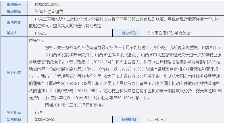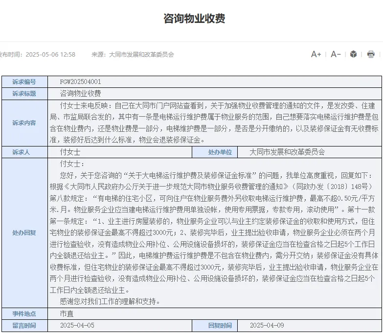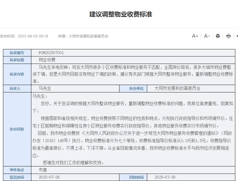 >事关物业收费:大同多小区业主反映处办回复来了!