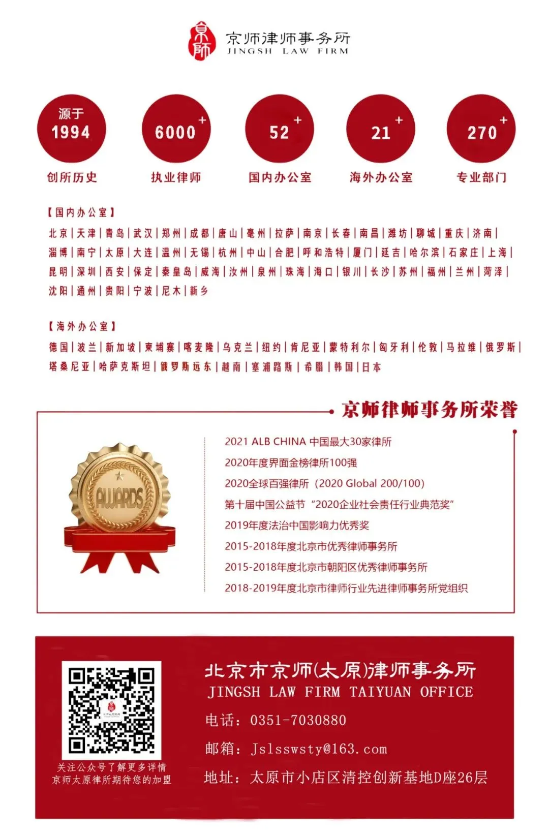 报告从律所介绍、党建工作、公益服务、专业化建设、律所取得荣誉等方面,全面展现了我所在履行社会责任方面付出的努力与行动。2025年,北京市京师(太原)律师事务所积极响应司法部党组对广大律师提出五点希望,贯彻落实二十大精神,积极投身公益法律服务,恪守职业道德,勤勉尽责。希望与社会各界沟通,接受社会各界的监督,推动律所在履行社会责任、服务客户、促进法治社会的发展等方面做得更好。