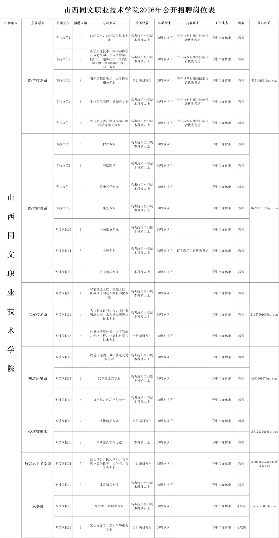 山西同文职业技术学院2026年公开招聘工作人员105名,招聘岗位及所需具体条件以《山西同文职业技术学院2026年公开招聘岗位表》(附件一)要求为准。