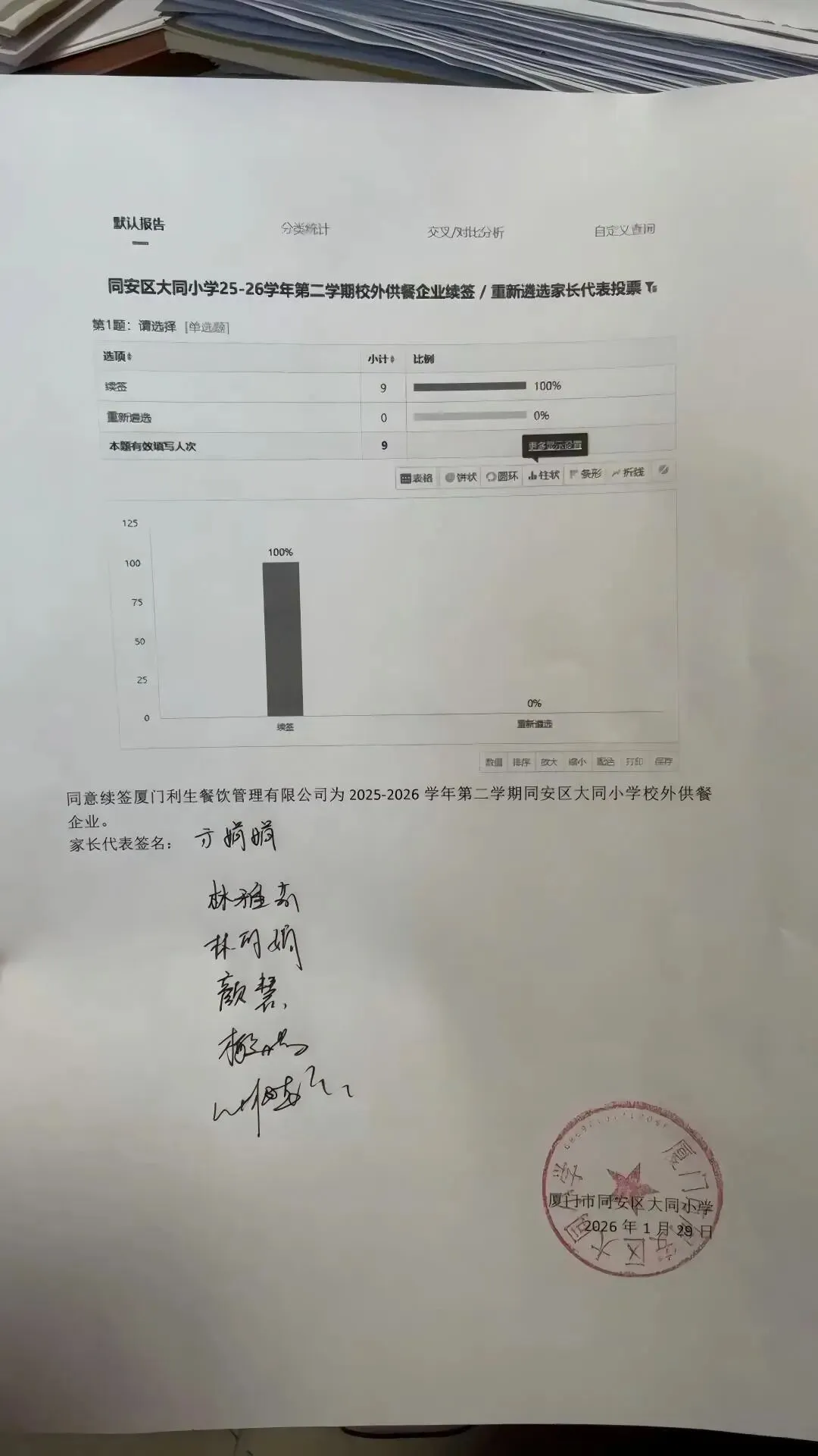 会上,家长委员代表通过投票表决,同意继续委托厦门利生餐饮管理有限公司为我校师生提供午餐配送服务。