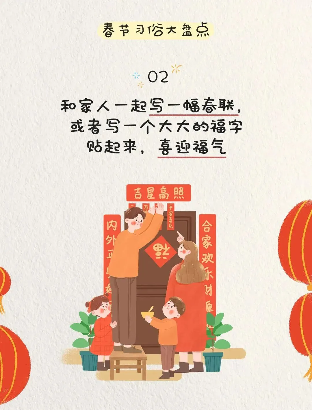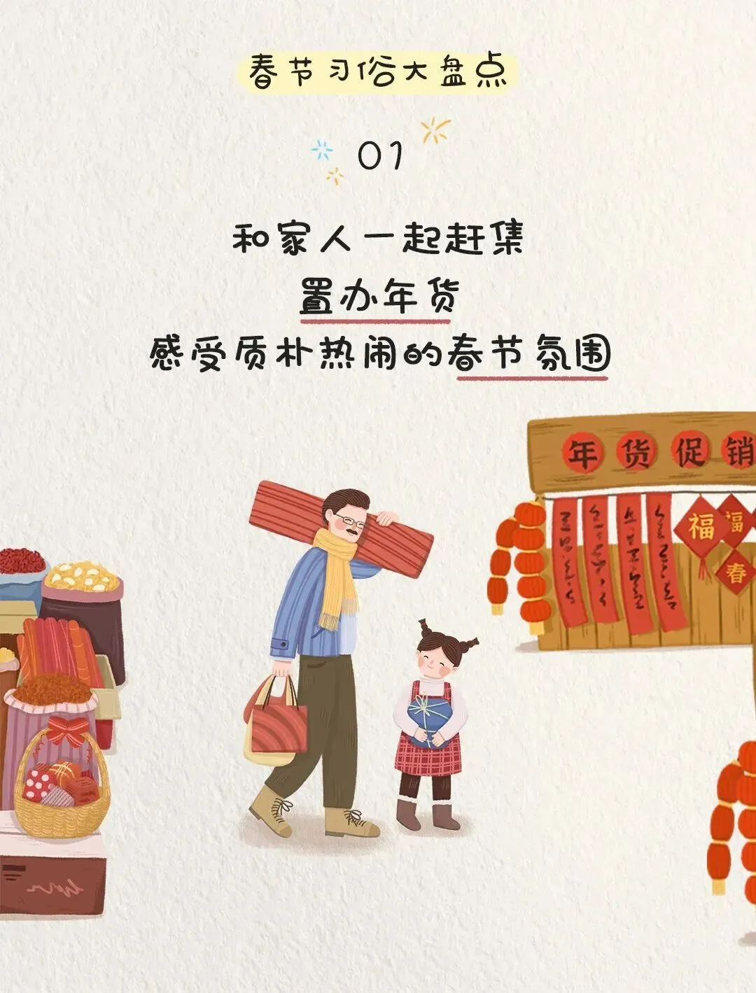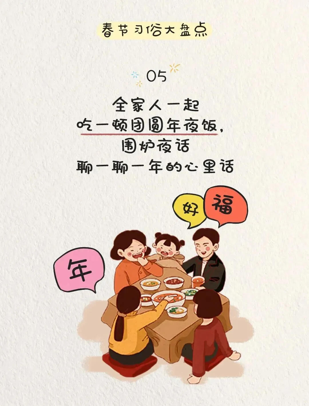 初一早晨,晚辈起床后,要先向长辈拜年,跪拜磕头或躬身作揖,祝福长辈健康长寿,万事如意。长辈受拜以后,要将事先准备好的“压岁钱”分给晚辈。在给家里的长辈拜完年之后,孩子外出遇见他人时也要满脸笑容地贺新年,互道“恭喜发财”、“四季如意”、“新年快乐”等吉祥的话语。