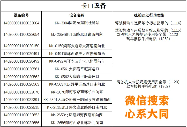 大同市公安局交通管理支队决定启用以下1处超限超载检查站点货运车辆不进站违法抓拍电子设备以及12处抓拍驾驶机动车违反禁令标志指示的、驾驶机人未按规定使用安全带、驾车接拨手持电话的违法抓拍电子设备。本通告自2026年1月30日开始,通告时间为30天,通告结束后所有违法数据将依法予以行政处罚。