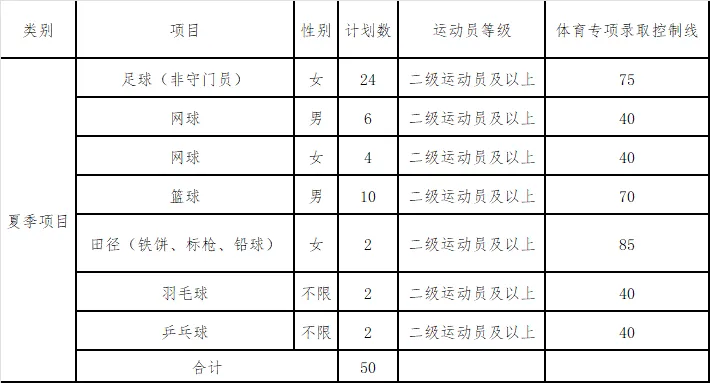 2.体育专项成绩最低录取控制线:足球75分、田径85分、篮球70分、网球40分、羽毛球40分、乒乓球40分。具体见各项目招生计划表。