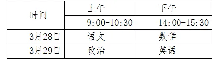 考生必须参加普通高考报名所在地省级招生考试机构组织的文化考试。考试科目为语文、数学、政治、英语四科,每科满分为150分,四科满分为600分,使用国家通用语言文字作答。时间安排如下:
