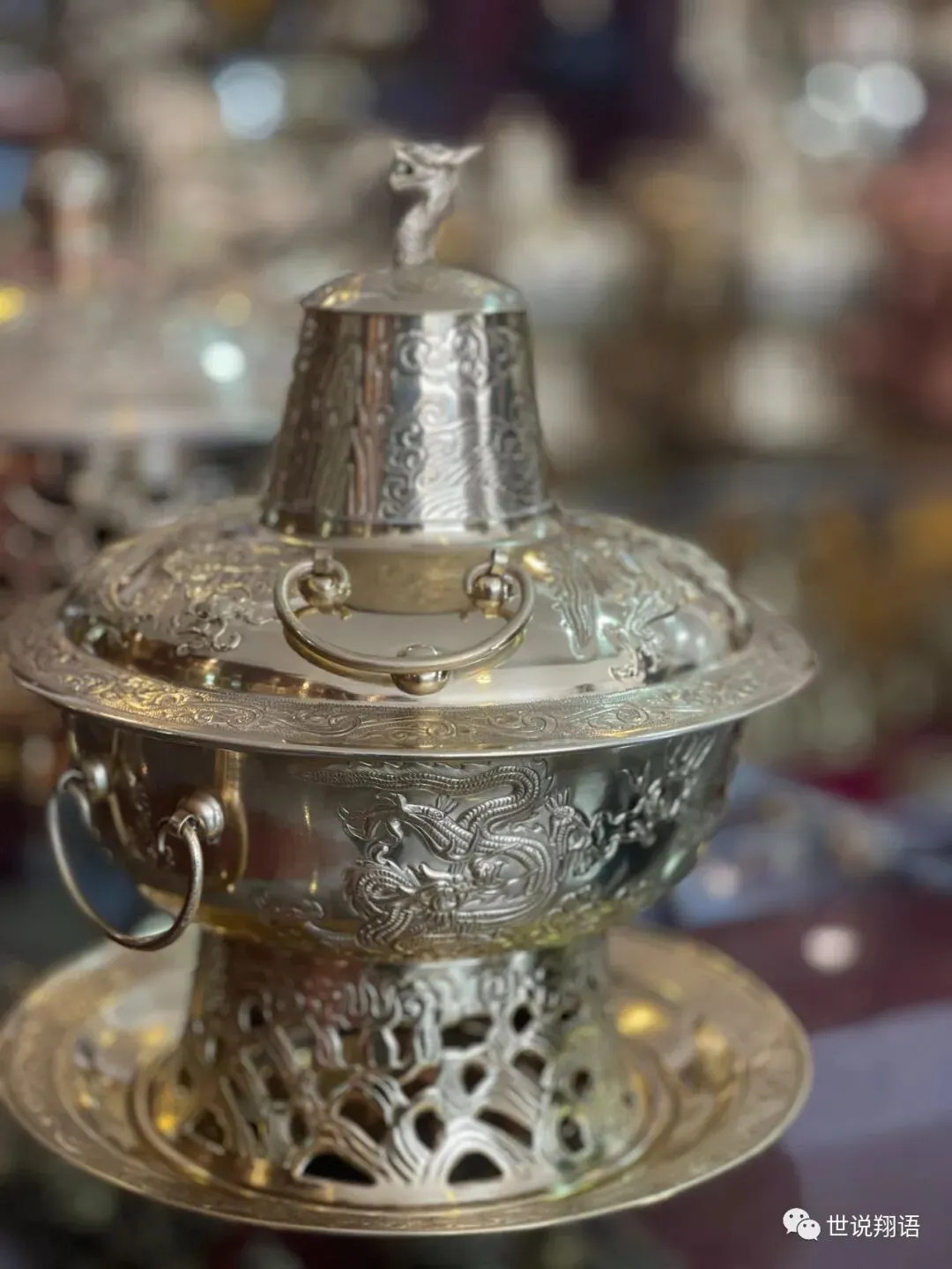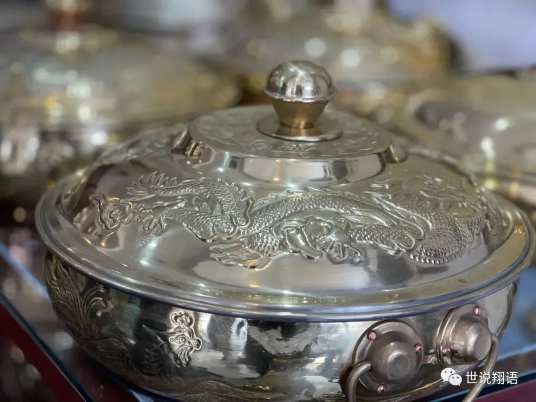 自此,广交会上大同铜火锅开始进入国际市场,八九十年代,北京的赛特、燕莎、友谊商店里,大同铜火锅也是以近乎如今奢侈品一样存在,二三十公分高的一个小铜火锅售价也是在好几百块以上,友谊商店里更是需要使用外汇兑换券才能购买。取自大同明代琉璃九龙壁的"九龙奋月"铜火锅成为大同铜火锅的高端代表,火锅通身錾刻九条龙纹,以峭石、海浪、祥云补白。火筒盖平雕龙身,龙头衔珠探出盖面形成提手;用餐时,热气腾腾、炭火隐射,龙纹隐约于云蒸霞蔚之间,张牙舞爪,蔚为壮观。那个时候,获奖,参展,再获奖,再参展,大同铜火锅的高光时刻就此展开。