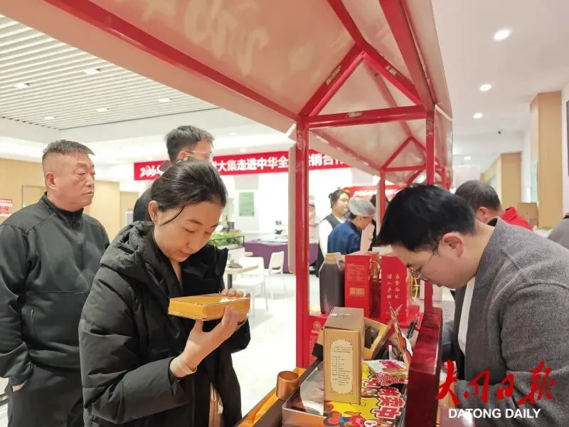 年货大集现场,大同黄花、恒山黄芪、广灵小米等特色农产品与非遗文创礼盒尤为抢眼,展位前人头攒动,香气四溢的小米凉糕、玻璃水饺等品鉴区前排起长队,不少员工表示:“不出单位就能买到地道的大同年货,供销品质更让人放心。”