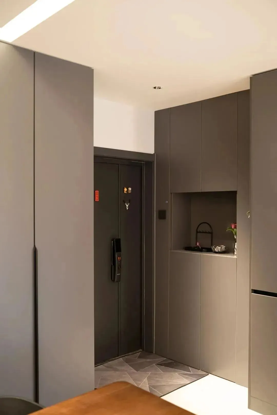 家里显得凌乱,多半是因为物品都暴露在视线中。嵌入式收纳能很好解决这一问题:将冰箱嵌入厨房橱柜,柜门统一设计,视觉上整洁大气;衣柜与墙体做平,侧面不凸出,既节省空间又避免磕碰。玄关处做一个35厘米深的嵌入式鞋柜,不会占用门口过道,大件行李也能轻松通过。需要注意的是,嵌入式家具需提前规划,最好在改水电阶段就确定好尺寸,安装后柜体与墙面之间的缝隙要用美缝剂填实,以防积灰。