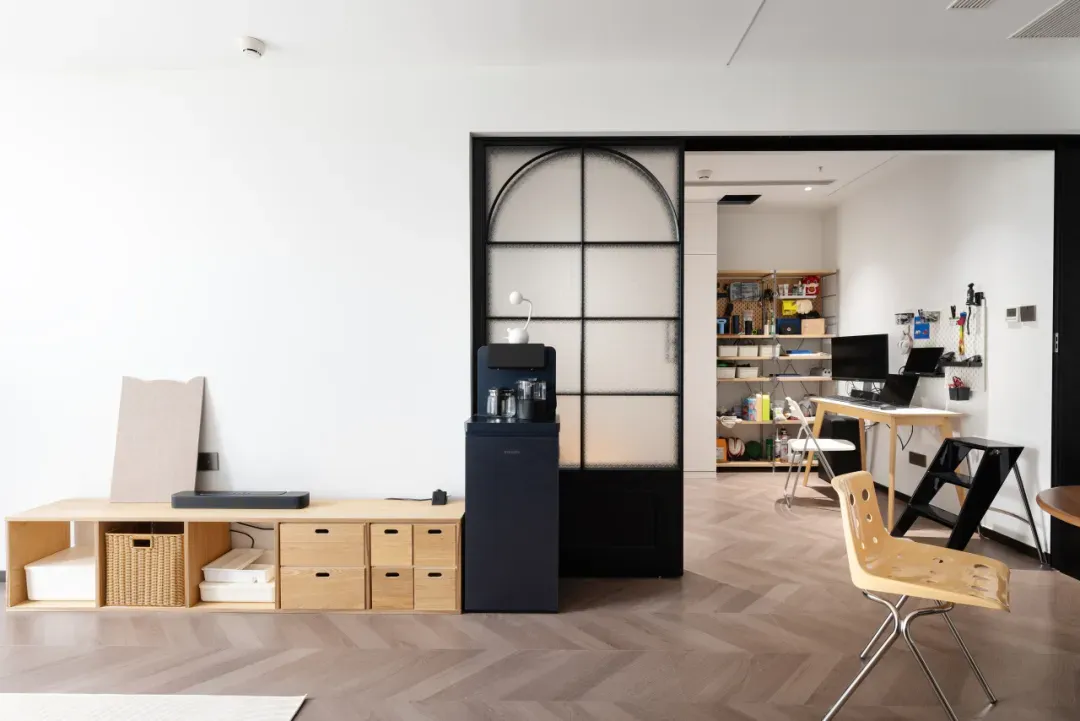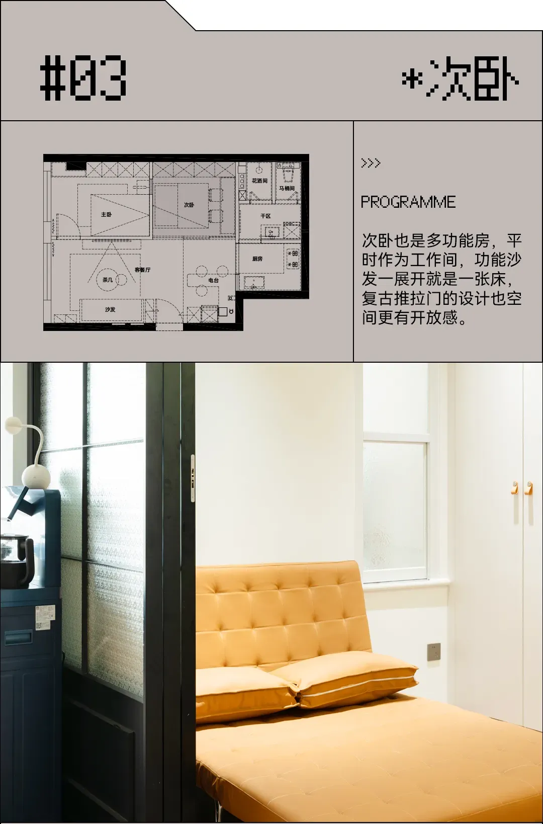 一扇充满复古感的弧形田字格移门后,藏着多功能次卧。