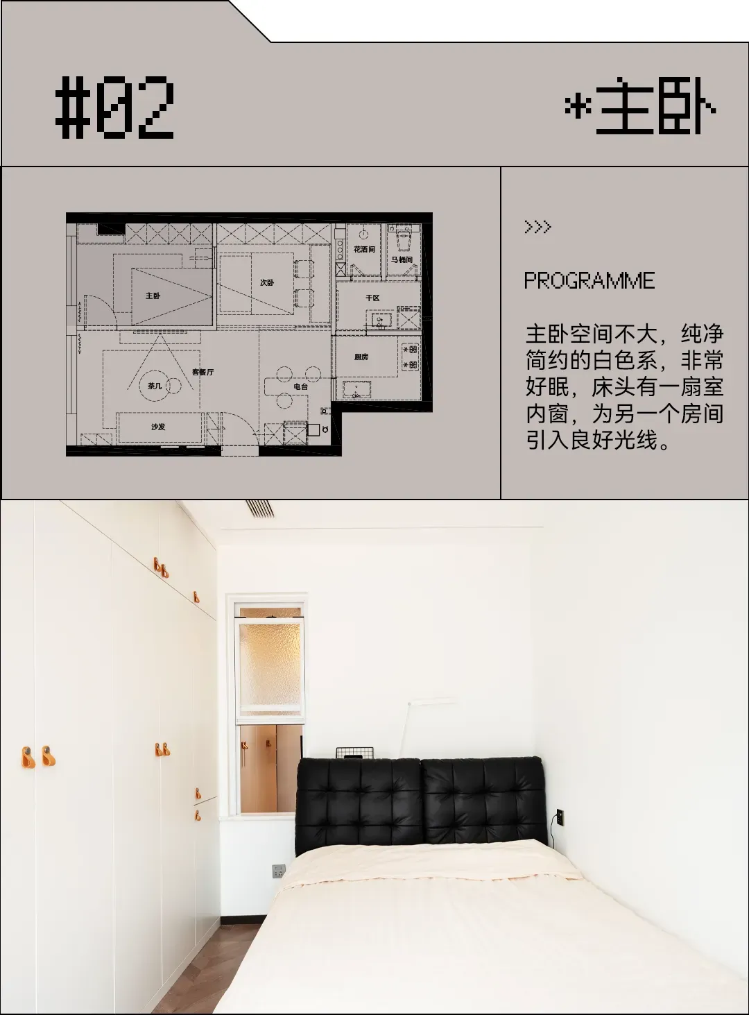 借光之窗:床头一道可上下滑动的磨砂玻璃窗,巧妙为次卧引入自然光线。
