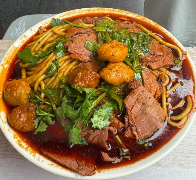 重点说说这牛肉丸子面:做法挺讲究,也挺“粗暴”。牛肉剁碎了,加调料淀粉揉成丸子,先炸后煮。面条得是特制的,耐煮。最关键是那勺汤,牛骨熬的底,铺满厚厚一层红油辣子。端上来,红彤彤的一碗,看着吓人,吃着过瘾。一口面,一口丸子,再喝口汤,额头微微冒汗,这才是临汾人的“精气神”。