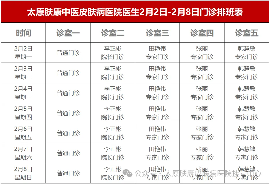 2月2日至2月8日太原肤康中医皮肤病医院医生出诊详情见下表: