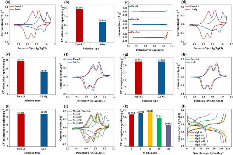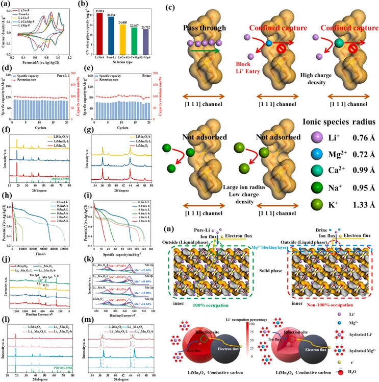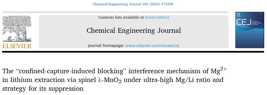 随着锂离子电池需求的快速增长,全球对锂资源的需求呈现井喷态势。我国盐湖卤水中的锂资源储量丰富,占比超过70%,因此实现盐湖卤水的高效开发至关重要。电控离子交换(ESIX)技术因其选择性高、能耗低、环境友好等特点,已成为盐湖提锂的重要研究方向。该技术通过电场调节电活性材料的价态,结合氧化还原反应与溶液切换的操作模式,实现锂离子的选择性分离与富集。在众多电活性提锂材料中,锰酸锂因其独特的三维锂离子通道和对锂离子的高选择性,被视为理想的提锂材料。然而,我国盐湖卤水多为低品位卤水,普遍具有高镁锂比以及低锂离子浓度的特点。由于镁和锂在元素周期表中处于对角线位置,离子半径相近,化学性质相似,镁离子的存在会严重干扰锂的选择性分离,导致锰酸锂提锂性能急剧下降。目前,大量研究集中于材料改性、工艺优化及装置创新,但对于镁离子引起性能衰减的内在机制尚缺乏深入、统一的认知。因此,明确镁离子的干扰机制,对优化提锂措施具有重要的指导意义。