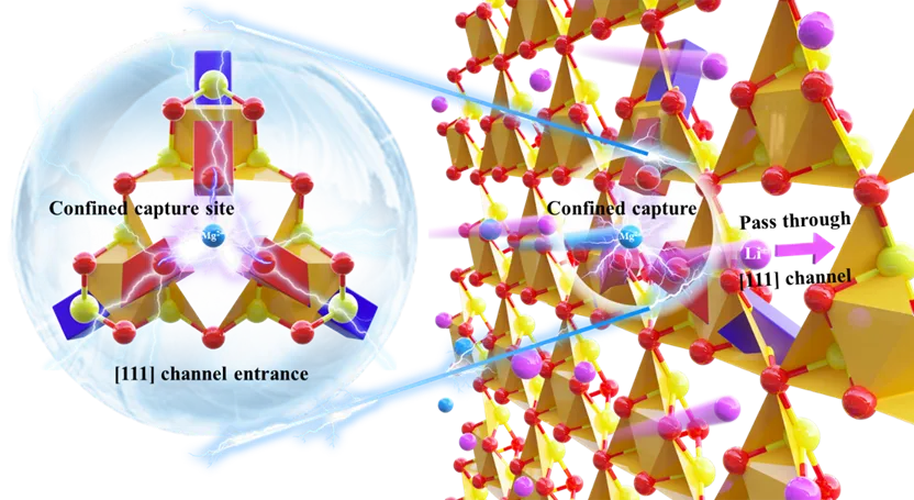 由图可知,本文提出了镁离子干扰提锂的微观机制—“限域捕获诱导阻塞”,具体为由于自身的高电荷密度,电场驱动下的镁离子在靠近由第一氧层构成的[111]孔道(锂离子迁移孔道)入口时与氧原子产生较强的库伦相互作用,使镁离子在[111]孔道入口处被“限域捕获”,从而对孔道造成阻塞,最终,镁离子阻碍了锂离子的嵌入,抑制提锂性能。