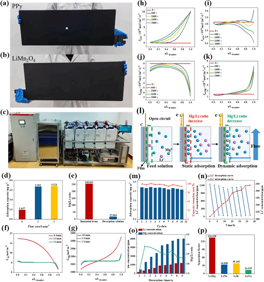基于上述机制,本研究在不同流量条件下对模拟卤水进行了吸附实验,结果证实流量对提锂性能具有显著影响。随后,通过COMSOL软件建立物理模型发现:在静态吸附条件下,腔室中存在严重的浓差极化现象,导致锰酸锂电极附近的锂离子浓度极低;同时,镁离子在电极附近明显富集。这两个现象共同造成电极附近的镁锂比远高于主体溶液(模拟卤水或实际卤水)。考虑到较高的镁锂比会对锂提取过程产生更强干扰,静态吸附下的提锂性能因而较差。而在溶液流动的动态吸附模式下,锂离子的浓差极化与镁离子的富集均得到缓解,有效抑制了电极表面及内部镁锂比的异常上升,从而提升了提锂性能。最后,本研究在总面积为11.040 m2的中试装置中,针对实际卤水(CLi = 0.35 g/L, CMg = 120 g/L)开展了实验,取得了良好的效果。综上所述,以上结果表明,尽管镁离子的存在对提锂过程构成一定的干扰,但由于锰酸锂具有优异的选择性与稳定性,该技术仍展现出良好的工业化应用前景。